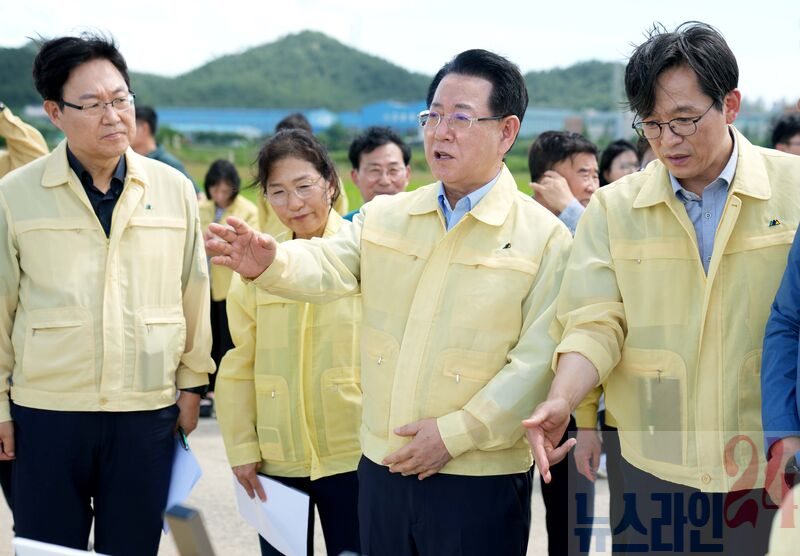 김영록 전라남도지사가19일 오후 영암 삼호읍 집중호우 피해현장을 방문, 피해상황 등을 점검하고 시설 조속 복구 등을 지시하고 있다.