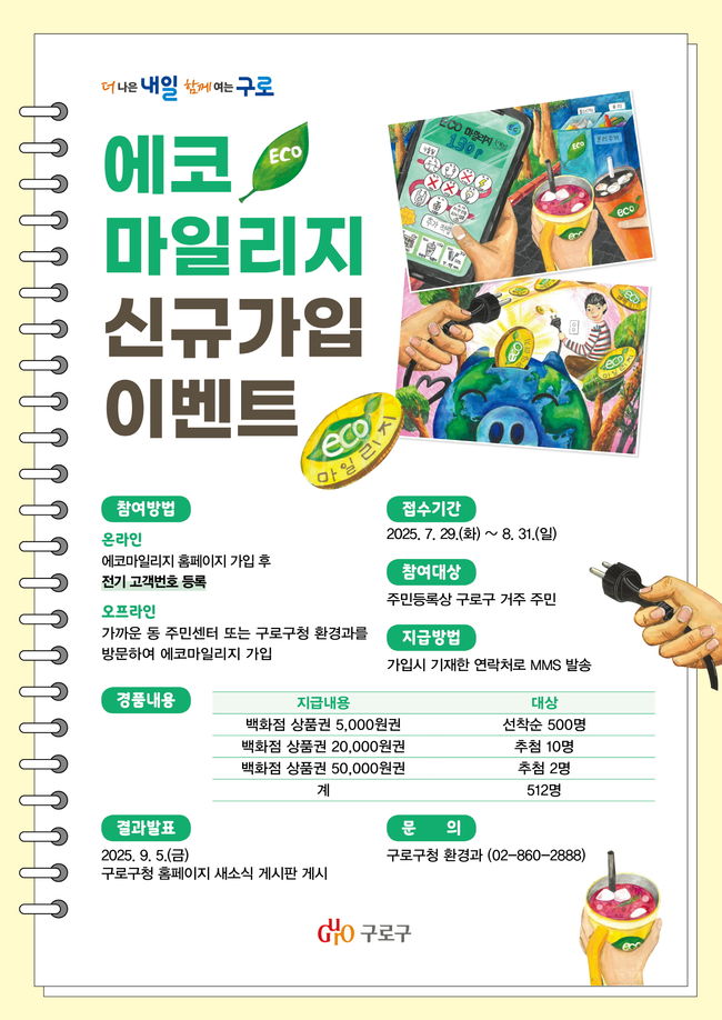 서울 구로구(구청장 장인홍)는 오는 29일부터 다음 달 31일까지 구민의 자발적 에너지 절약 참여를 유도하기 위해 ‘에코마일리지 신규가입 이벤트’를 실시한다고 24일 밝혔다.