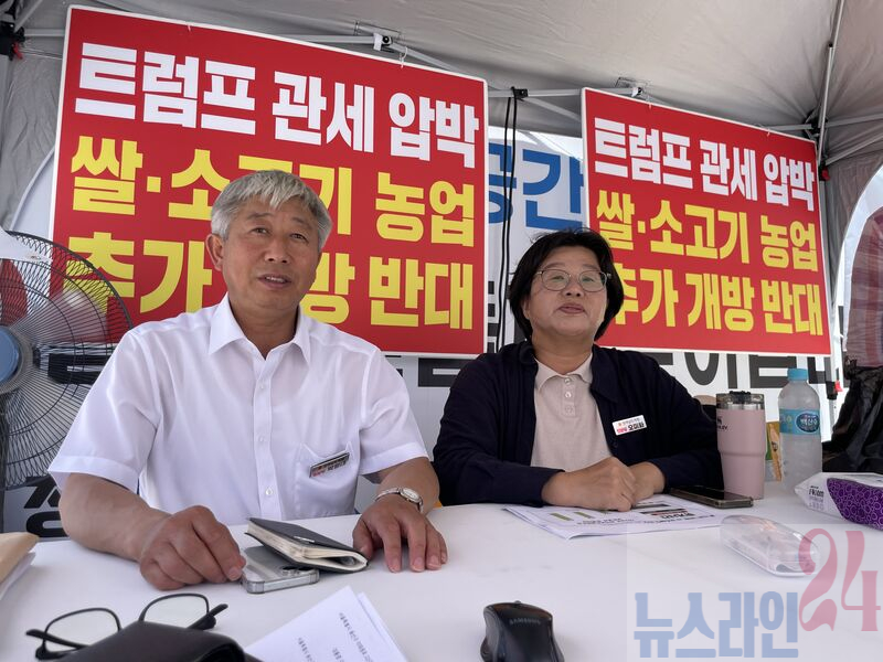 트럼프 미국 대통령의 일방적인 관세협박과 이에 따른 정부의 쌀·소고기 등 농업추가개방 가능성에 반대해, 전라남도의회 진보당 소속 박형대(장흥1), 오미화(영광2)의원이 28일 전남도청 앞에서 농성에 돌입했다.