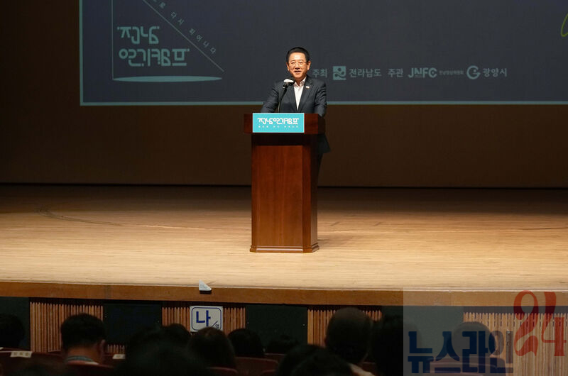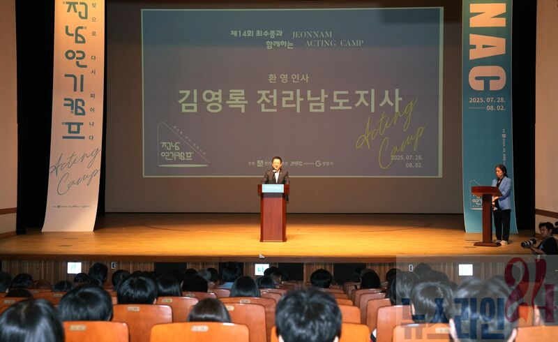 김영록 전라남도지사가 28일 오후 광양 문화예술회관에서 열린 ‘제14회 최수종과 함께하는 전남연기캠프 입소식’에 참석, 축사를 하고 있다.