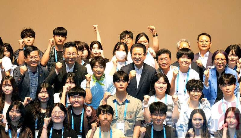 김영록 전라남도지사가 28일 오후 광양 문화예술회관에서 열린 ‘제14회 최수종과 함께하는 전남연기캠프 입소식’에 참석, 연기캠프에 입소한 도내 청소년들과 기념촬영을 하고 있다.