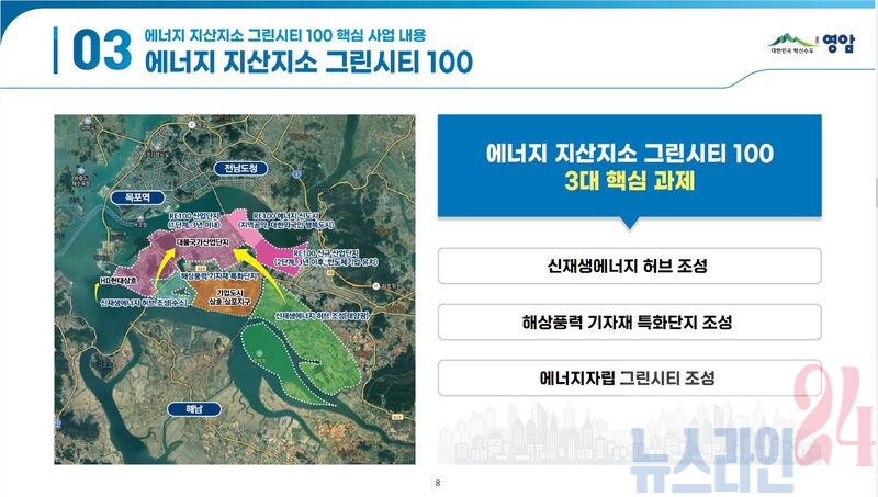 ‘바로 시작하는 미래, RE100 영암’을 구호로, 삼호읍 대불국가산업단지를 일대에 △신재생에너지 허브 △해상풍력 기자재 특화단지 △에너지자립 그린시티를 조성하는 청사진을 제시한 것.
