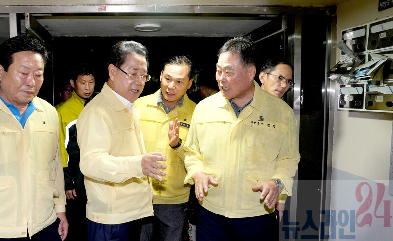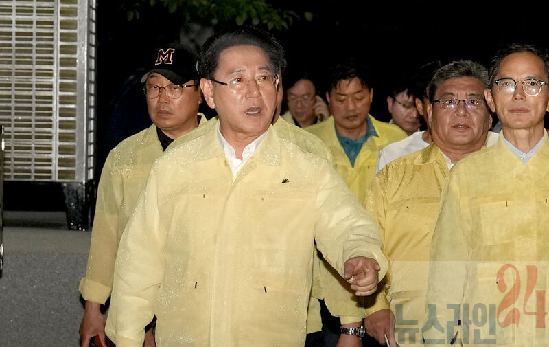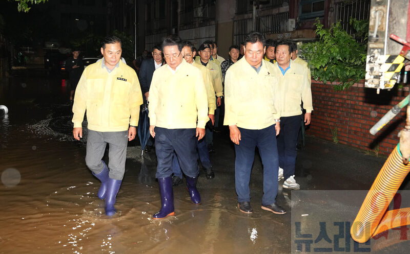 김영록 전라남도지사가 3일 저녁 1시간 동안 극한호우가 쏟아진 무안군 무안읍보건소 등 주변 가구 침수 피해 현장을 방문, 피해 현황을 청취하고 신속한 복구 대책을 당부하고 있다.