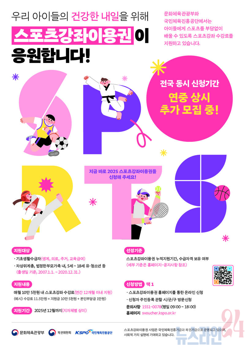 목포시는 저소득층 유·청소년의 스포츠 참여 기회를 확대하고 체력 향상 및 사회적 소외감 해소를 위해 추진 중인 ‘스포츠강좌이용권 지원사업’의 2025년 이용자를 연중 상시로 추가 모집한다.