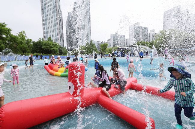 중앙공원 물놀이장에서 아이들이 물놀이를 즐기고 있다.
