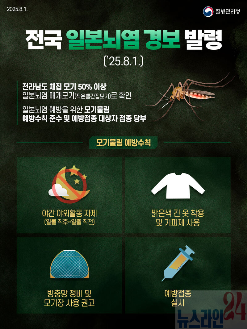 일본뇌염을 포함한 모기매개감염병은 여름철 고온다습한 환경에서 모기 활동이 활발해지면서 급증할 수 있고, 고위험군은 감염 시 심각한 신경계 합병증을 유발할 수 있다.