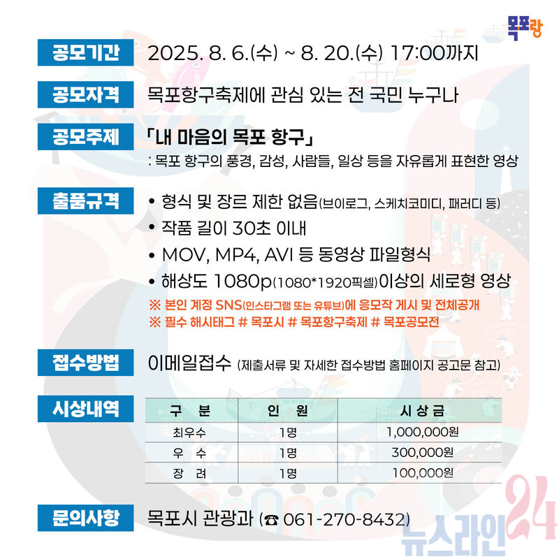 목포시가 8월 20일(수) 17시까지 ‘2025 목포 항구축제 숏폼 공모전’을 개최한다. 이번 공모전은 목포 항구의 매력을 전국에 알리고, 시민과 관광객이 함께 참여하는 축제 문화를 조성하기 위해 마련됐다.