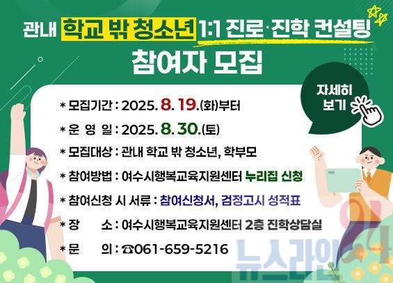 여수시(시장 정기명)가 관내 학교 밖 청소년과 학부모를 대상으로 오는 8월 30일(토) 여수시행복교육지원센터 진학 상담실에서 ‘1:1 진로‧진학 컨설팅’을 운영한다. 모집인원은 학부모를 포함해 총 48명이다.