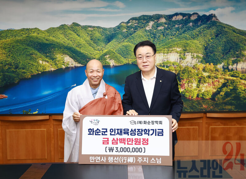 화순군(군수 구복규)은 지난 11일 전통 사찰 만연사 행선 주지스님이 (재)화순장학회에 지역 인재 육성을 위한 장학금 300만 원을 기부했다고 밝혔다.