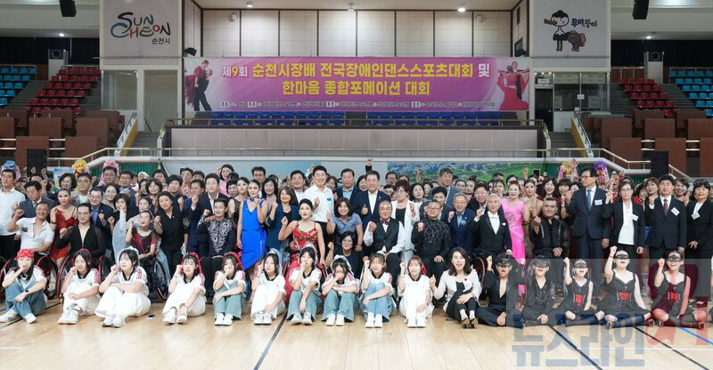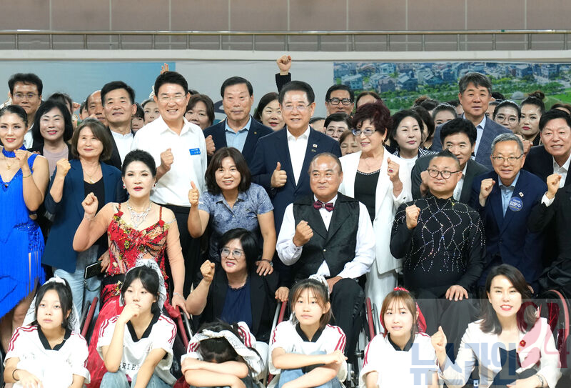 김영록 전라남도지사가 17일 순천 팔마실내체육관에서 열린 ‘전국장애인댄스스포츠대회 및 한마음 종합 포메이션 대회’에 참석해 주요 내빈들과 기념촬영을 하고 있다.