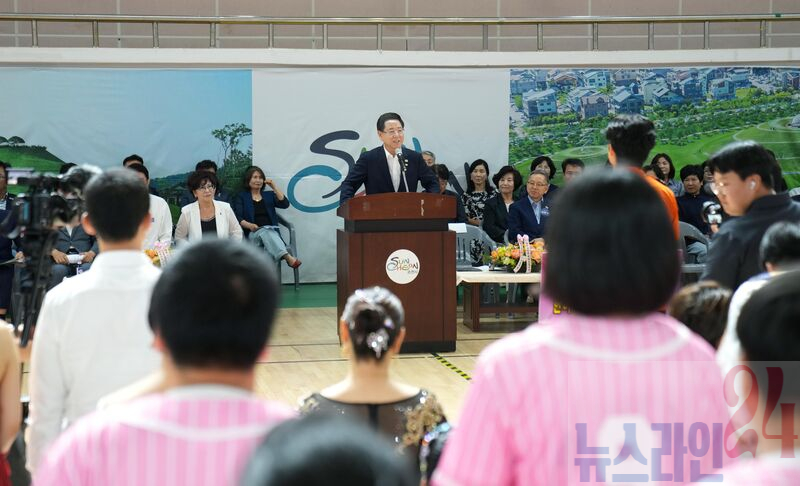 김영록 전라남도지사가 17일 순천 팔마실내체육관에서 열린 ‘전국장애인댄스스포츠대회 및 한마음 종합 포메이션 대회’에 참석해 축사를 하고 있다.