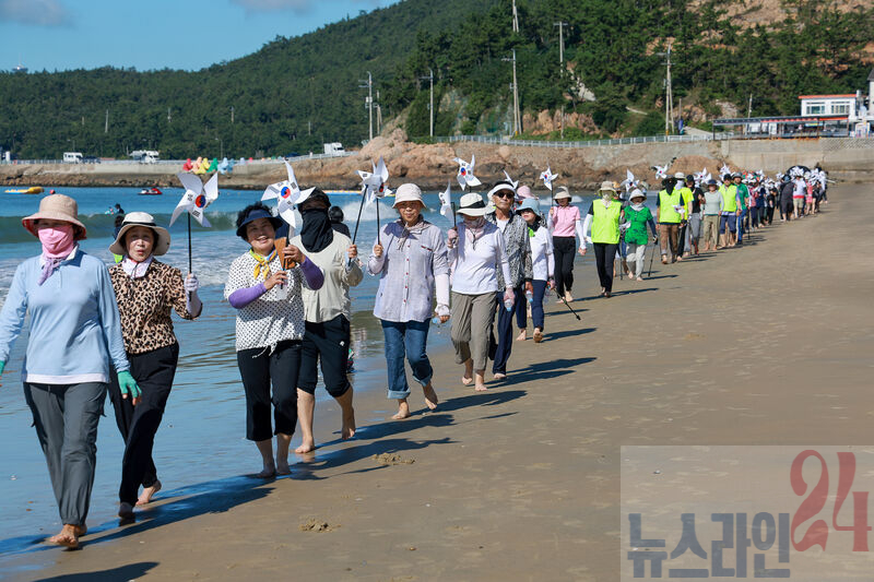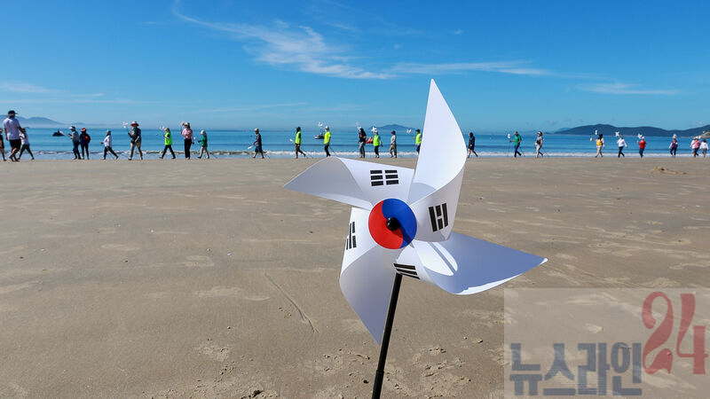 참가자들은 태극기와 바람개비 태극기를 들고 명사십리 해변 1.6km를 맨발로 걸으며 광복의 의미와 자유의 소중함을 되새기는 시간을 가졌다.