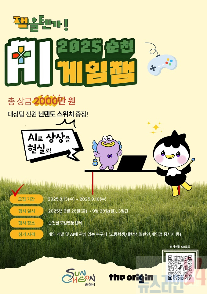 순천시(시장 노관규)가 AI 기술을 결합한 전국 규모의 게임잼 행사를 개최한다. 이번 행사는 원도심 클러스터에 입주 예정인 게임 특화 종합 콘텐츠기업인 ㈜디오리진과 협업 추진해 게임산업에 대한 이해를 높이고 인재 발굴 등 콘텐츠산업의 성장 발판을 다지기 위해 준비됐다.