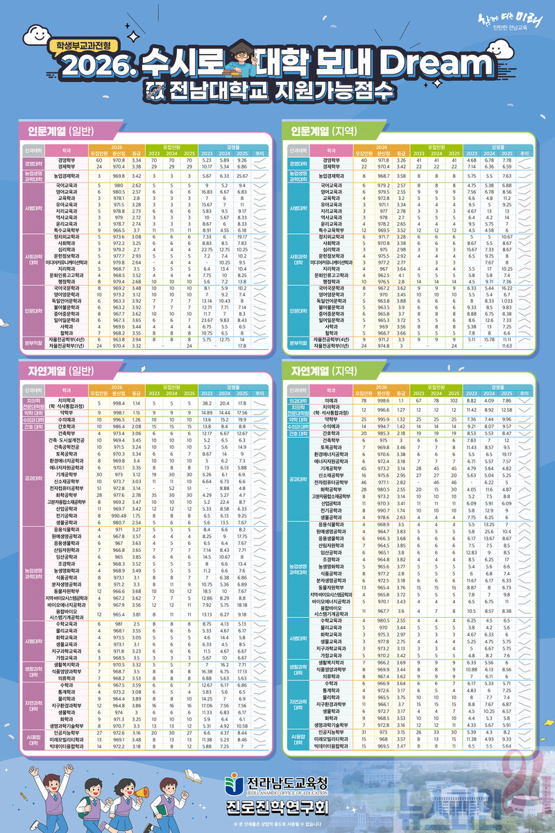 전라남도교육청(교육감 김대중)이 2026학년도 대학입시 수시모집 원서 접수를 앞두고 학생·학부모가 과학적이고 객관적인 자료를 바탕으로 지원 전략을 세울 수 있도록 ‘2026. 대입일정 정리해 DREAM’과 ‘2026학년도 수시로 대학 보내 DREAM’을 제작·보급했다.