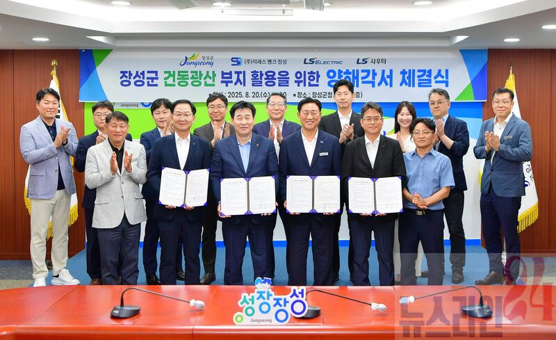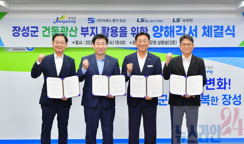 군은 20일 군청 상황실에서 ㈜석세스뱅크장성, LS일렉트릭㈜, LS사우타㈜와 양해각서를 체결했다. 김한종 장성군수, 전재연 ㈜석세스뱅크장성 대표이사, 정현만 LS일렉트릭㈜ 데이터센터 팀장, 박우범 LS사우타㈜ 대표 등 관계자들이 협약식에 참석했다.