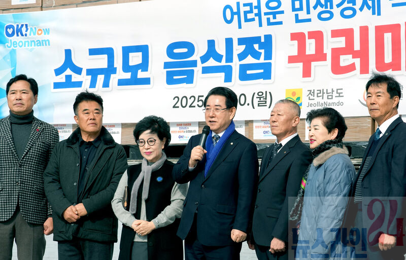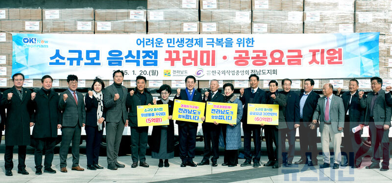 김영록 전라남도지사가 20일 전남도청 만남의 광장에서 열린 ‘소규모 음식점 꾸러미·공공요금 지원’ 행사에서 참석자들과 경기침체 장기화로 어려움을 겪고 있는 음식점들의 민생경기 조기회복을 위한 퍼포먼스를 하고 있다.