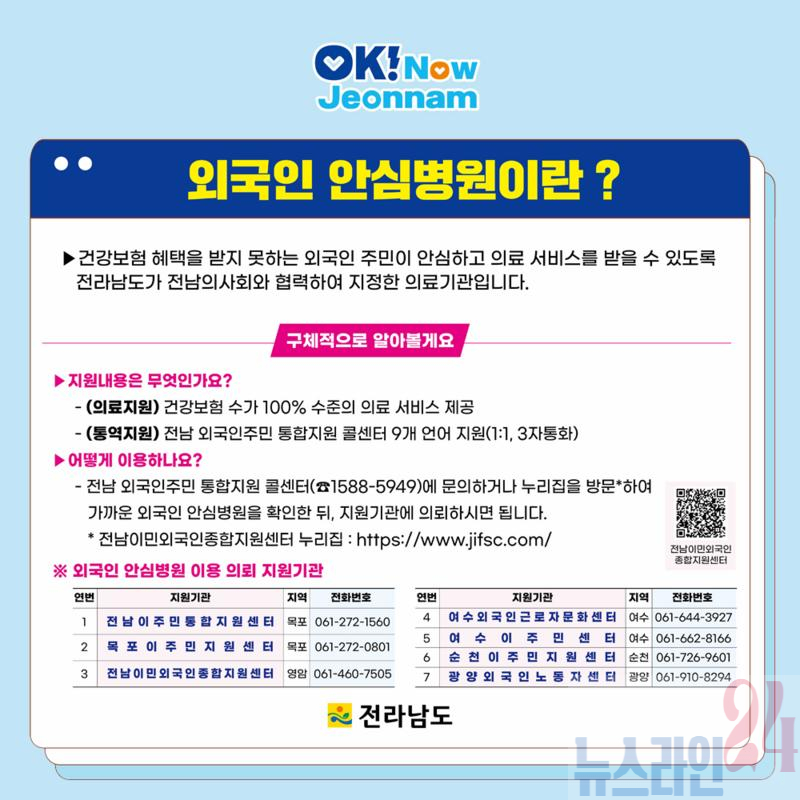 외국인 안심병원은 외국인 주민의 의료 접근성을 높이고 안정적인 의료서비스를 제공하기 위해 전라남도가 전남의사회와 협력해 지정하는 의료기관이다. 지정된 병원에서는 건강보험 미가입으로 의료 혜택을 받지 못하는 외국인에게 진료비의 약 30%를 감면해 의료비 부담을 완화한다.