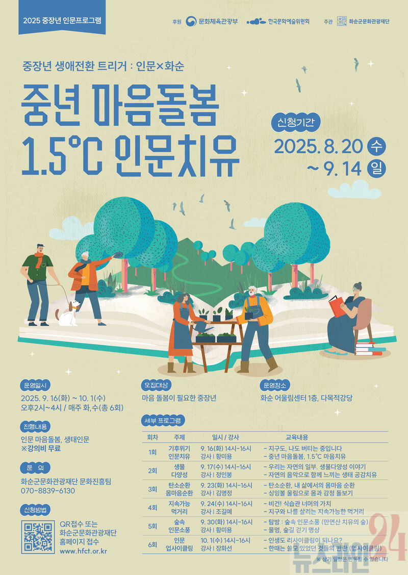 (재)화순군문화관광재단(이사장 구복규)은 문화체육관광부 산하 한국문화예술위원회가 후원하는 ‘2025년 중장년 인문프로그램’ 사업의 일환으로 ‘중장년 생애전환 트리거 : 인문X화순’을 진행한다고 21일 밝혔다.