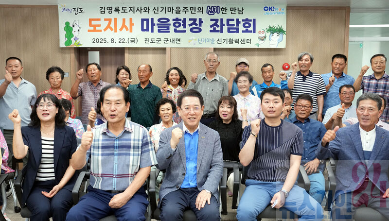 김영록 전라남도지사가 22일 오후 진도 신기마을을 방문, 주민들과 현장 좌담회를 갖고 기념촬영을 하고 있다.
