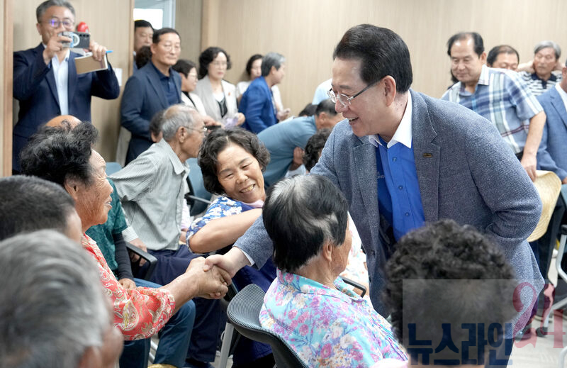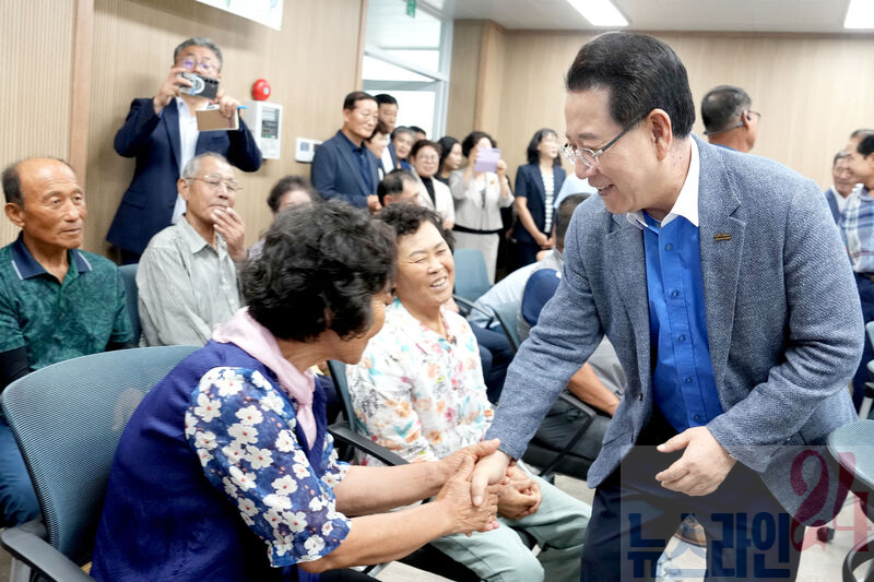 김영록 전라남도지사가 22일 오후 진도 신기마을을 방문, 주민들과 인사를 나누고 있다.