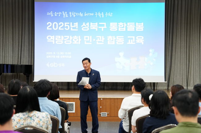 `2025년 성북구 통합돌봄 역량강화 민관합동 교육`에 참석한 이승로 성북구청장.성북구(구청장 이승로)는 지난 8월 12일과 19일 양일간 성북구청 4층 성북아트홀에서 ‘의료·요양·돌봄 통합지원 체계 구축을 위한 2025년 성북구 통합돌봄 역량강화 민관합동 교육’을 개최했다고 밝혔다.
