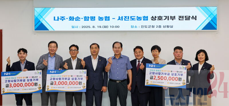진도군은 지난 8월 19일(화) 진도군청에서 서진도농협, 나주시 영산포농협, 화순군 이양청풍농협, 함평군 손불농협과 손을 맞잡고 고향사랑기부제 상호 기부금 전달식을 개최했다고 밝혔다.
