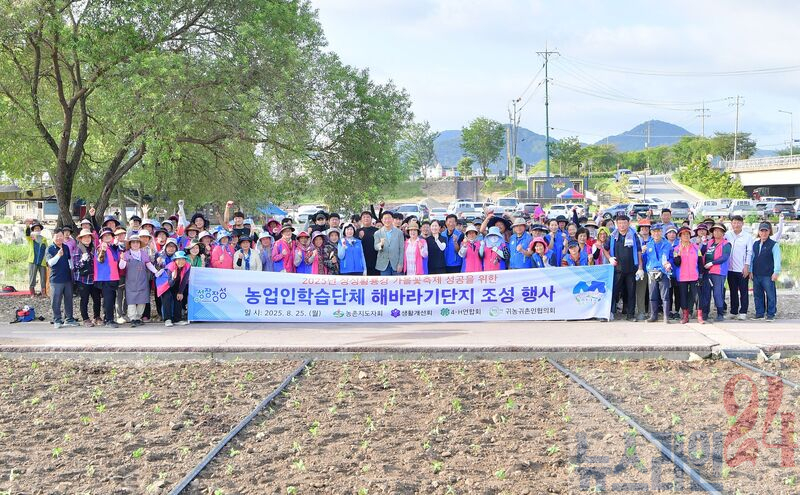 한국농촌지도자장성군연합회·한국생활개선장성군연합회·장성군4-H(에이치)연합회·귀농귀촌인협의회 회원 200여 명이 장안교~연꽃단지 일원에 모여 해바라기단지를 조성했다.