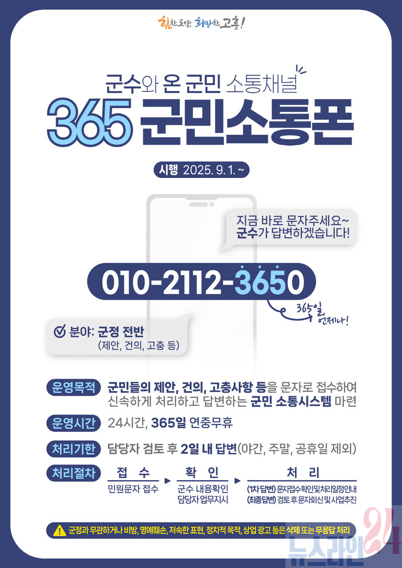 고흥군(군수 공영민)은 군민과의 소통을 강화하고, 현장의 목소리를 보다 폭넓게 수렴하기 위해 군수와 온 군민이 직접 소통할 수 있는 「365 군민소통폰」(010-2112-3650)을 개통하고, 오는 9월 1일부터 운영에 들어간다고 26일 밝혔다.