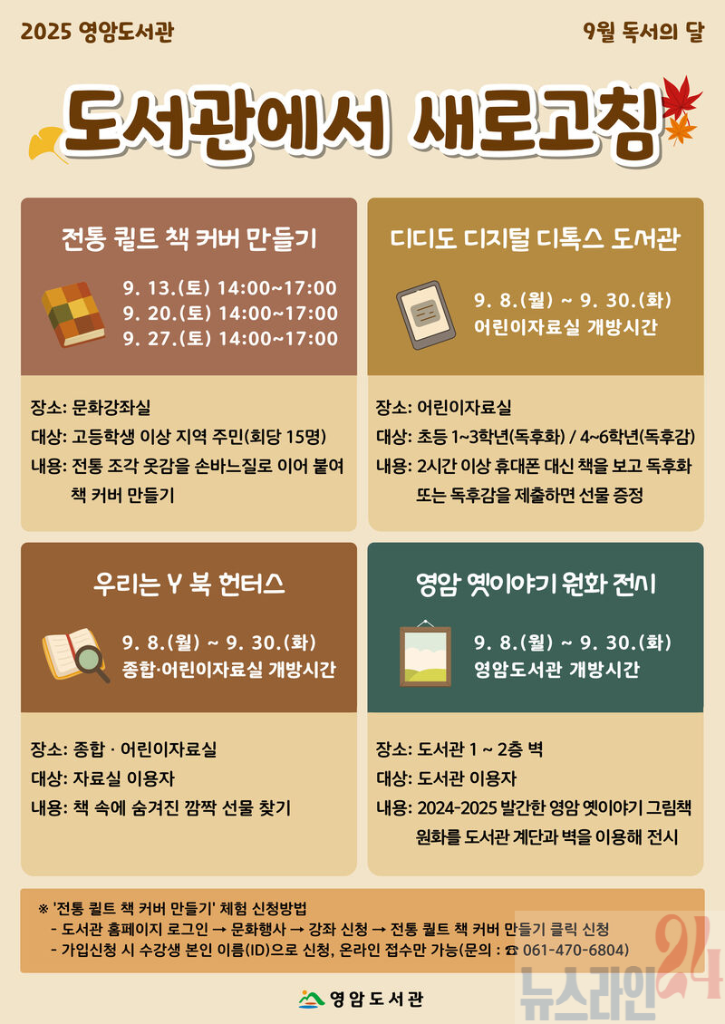 영암도서관이 9월 독서의 달을 맞아 ‘도서관에서 새로고침’을 주제로 영암군민이 도서관의 매력을 알고, 독서에 나서도록 다양한 문화 프로그램을 운영한다.