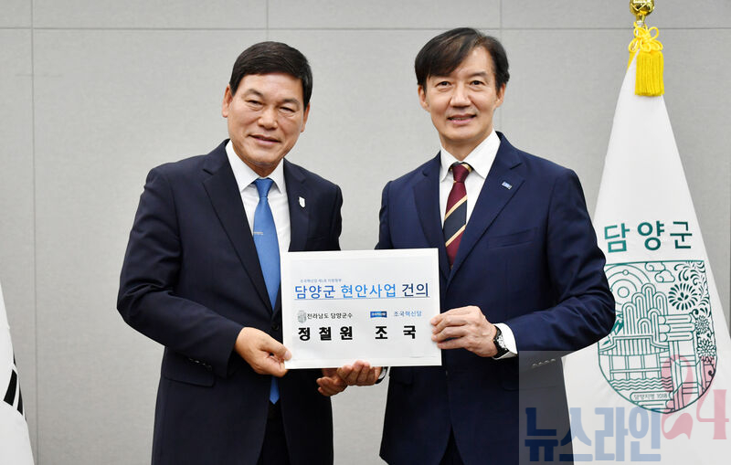 정철원 담양군수가 27일 담양군청을 방문한 조국 조국혁신당 혁신정책연구원장과 만나 지역 현안을 논의하고 당 차원의 협력을 요청했다.