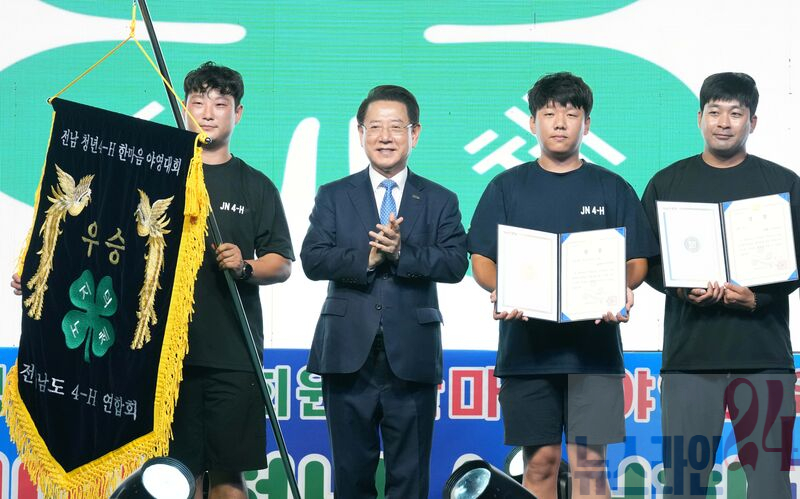 김영록 전라남도지사가 27일 진도 실내체육관에서 열린 ‘2025 전남 청년4-H회원 한마음 야영교육 봉화식’에 참석해 표창장을 수여한 뒤 기념촬영을 하고 있다.