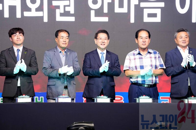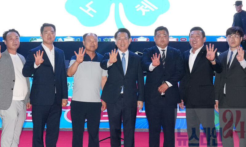 김영록 전라남도지사가 27일 진도 실내체육관에서 열린 ‘2025 전남 청년4-H회원 한마음 야영교육 봉화식’에 참석해 주요내빈들과 퍼포먼스를 하고 있다.