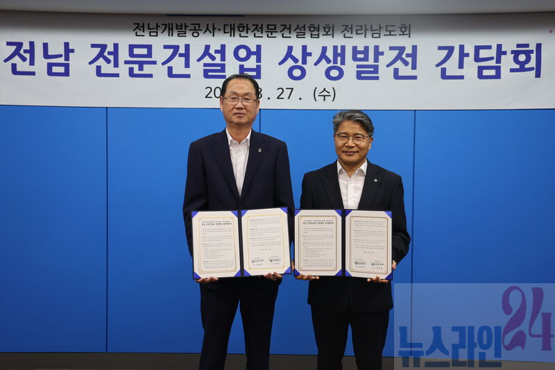 왼쪽 대한전문건설협회 전라남도회 강성진 회장, 오른쪽 전남개발공사 장충모 사장 전남개발공사(장충모 사장)은 27일 전남개발공사 대회의실에서 대한전문건설협회 전라남도회(회장 강성진)와 간담회를 열어 건설업계 현안을 공유하고 상생발전을 위한 업무협약을 체결하였다.