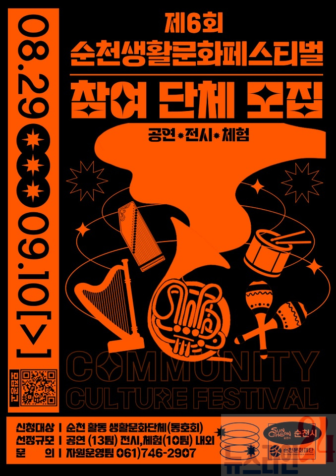 (재)순천문화재단(이사장 노관규)은 오는 10월 17일부터 10월 18일까지 순천조례호수공원 일원에서 개최하는 제6회 생활문화페스티벌 참여단체를 공개 모집한다.순천생활문화단체(동호회) 공연·전시·체험 및 순천생활문화밴드 경연대회에 참여할 단체를 오는 29일부터 9월 10일까지 모집한다.