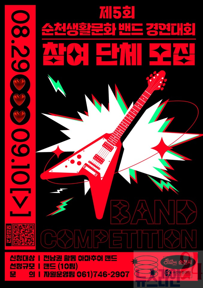 순천생활문화밴드 경연대회는 본선 진출 10팀을 선발해 경연을 펼치며 ▲대상 1팀(200만원) ▲최우수상 1팀(100만원) ▲우수상 2팀(각 70만원)에 시상금과 상패가 수여되며 ▲결선 진출 6팀은 각각 30만원 공연 지원금이 지급된다.