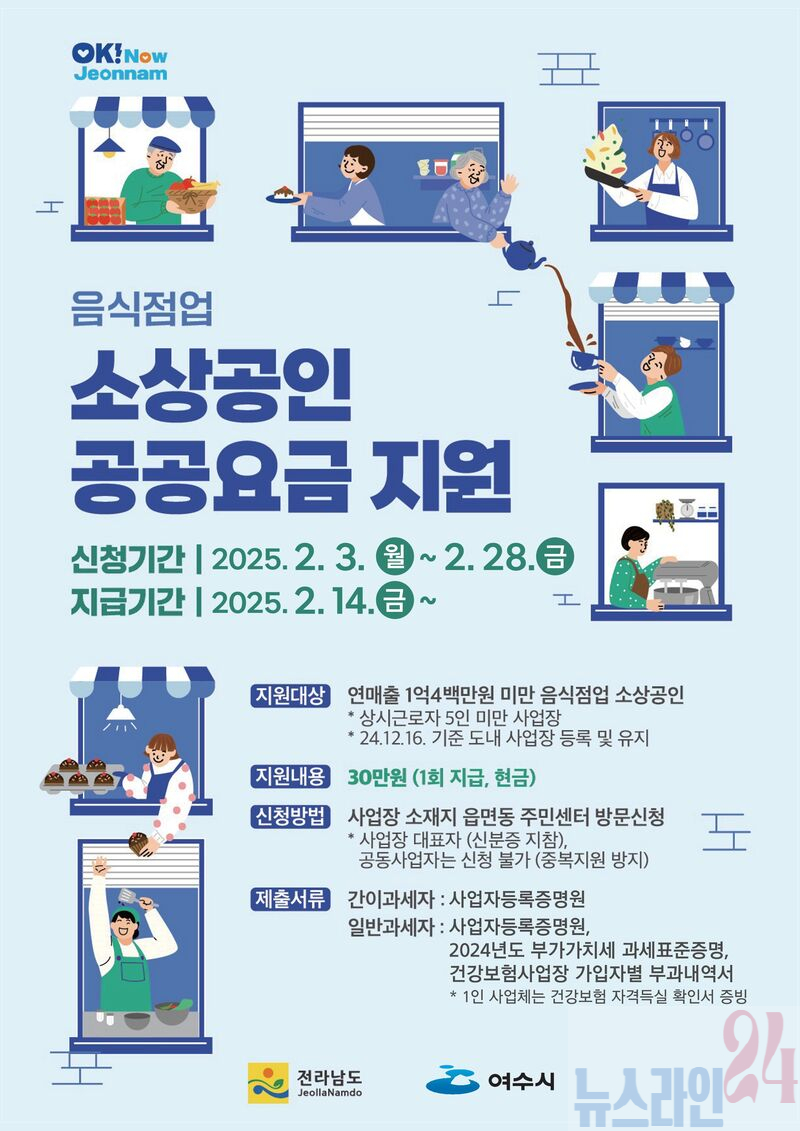 여수시(시장 정기명)가 소상공인이 운영하는 음식점 2,920개소에 공공요금 30만 원을 지원한다고 밝혔다.