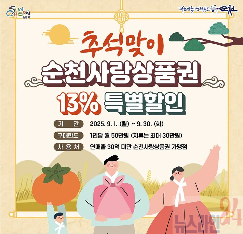 순천시(시장 노관규)는 추석명절을 맞아 9월 한 달간 순천사랑상품권 13% 특별할인 판매를 실시한다고 밝혔다.