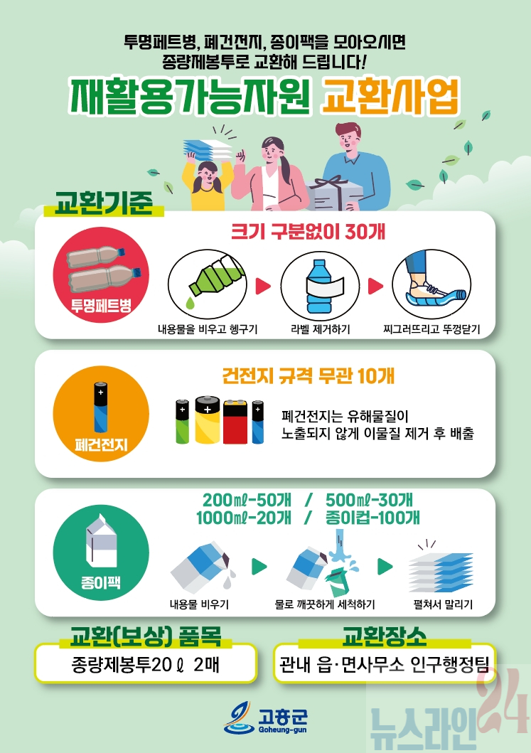 군은 지난 8개월 동안 주민 1,000여 명이 자발적으로 참여해 페트병 3만 개, 종이팩 2만 7천 개, 폐건전지 1만 6천 개를 종량제봉투 6,800여 장과 교환하는 성과를 거뒀다.
