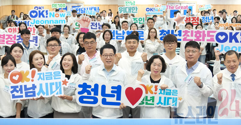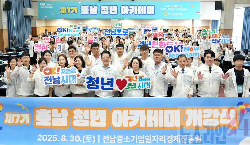 김영록 전라남도지사가 30일 전남중소기업일자리경제진흥원에서 열린 ‘제7기 호남 청년 아카데미 개강식’에 참석해 청년들과 기념촬영을 하고 있다.