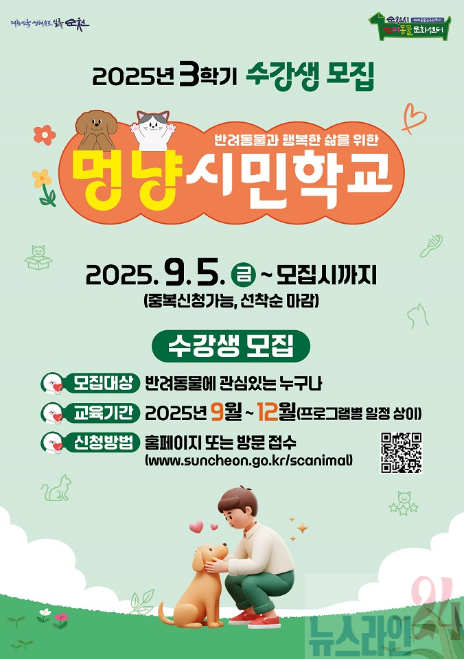 순천시(시장 노관규)는 오는 9월부터 반려동물문화센터(역전길 50, 조곡동)에서 반려동물과 반려인을 위한 교육 프로그램인 ‘멍냥시민학교 3학기’를 운영한다고 밝혔다. 특히 이번 학기에는 반려동물 관련 자격증 과정과 곤충을 주제로 한 어린이 대상 강좌를 신설하여 시민들의 큰 관심이 기대된다.