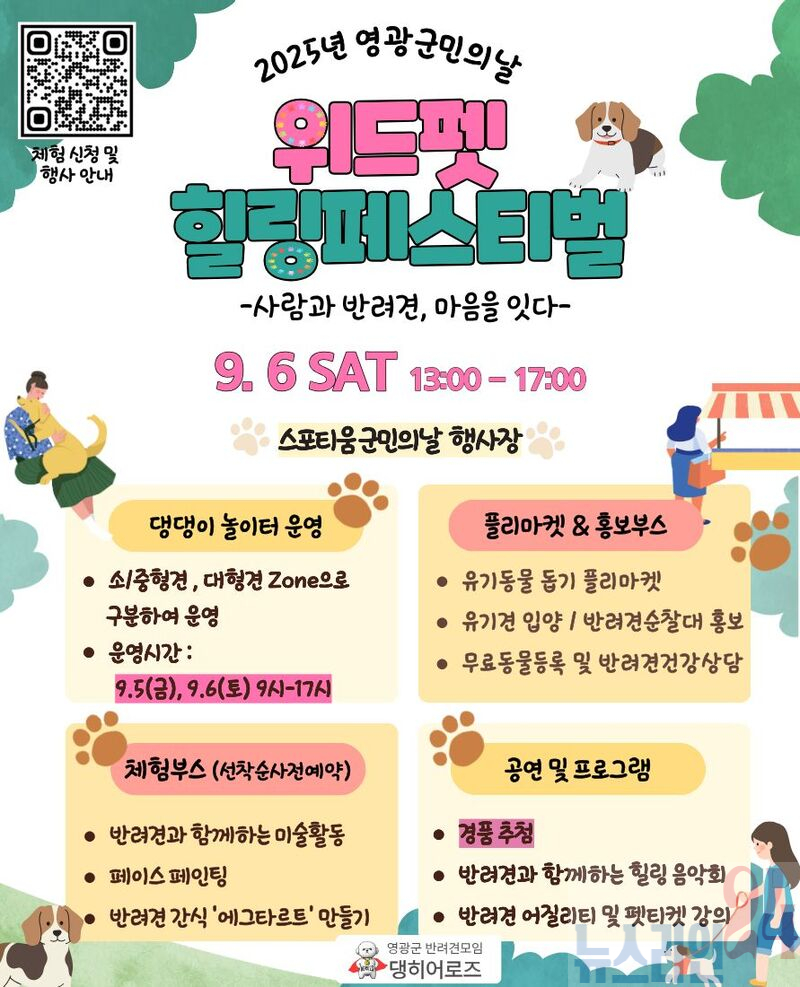 영광군민의날 추진위원회(위원장 신언창)와 영광군반려견모임 댕히어로즈(대표 조아라)는 오는 9월 6일(토) 13:00 ~ 17:00까지 영광스포티움 군민의날 행사장에서 위드펫 힐링페스티벌을 개최한다고 밝혔다.