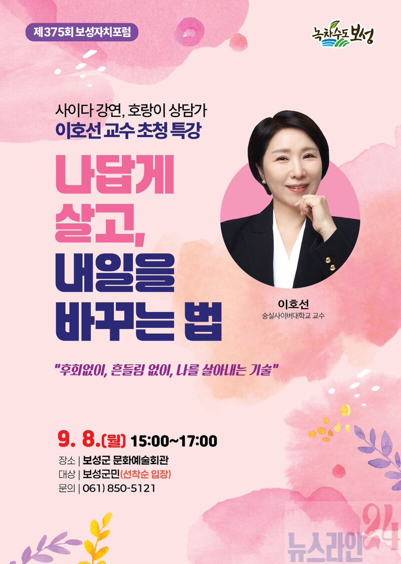한편, 보성자치포럼은 1999년 시작해 올해로 26년째, 375회를 이어온 보성군 대표 인문 교양 프로그램으로, 다양한 분야 전문가를 초청해 군민과 함께 지혜를 나누고 미래를 모색하는 열린 배움의 장으로 자리매김하고 있다.