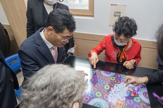 어르신들과 스마트테이블 프로그램을 체험하고 있는 이기재양천구청장.양천구(구청장 이기재)는 지역 내 노인 인구 증가에 대응해 스마트경로당 조성 사업을 확대한다고 2일 밝혔다.